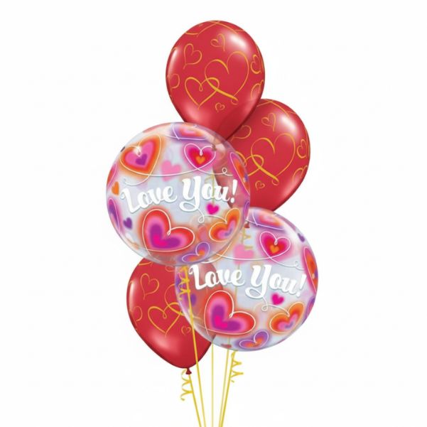 Lindo arreglo de globos compuesto por 2 Globos metalizados en forma de corazon de 18″ (45 cm), 3 globos latex estampados de 11″ (28 cm) y pesa.