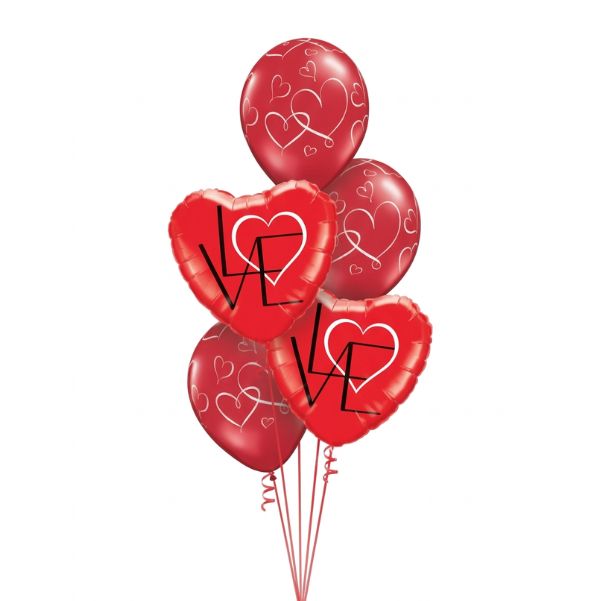 Lindo arreglo de globos compuesto por 2 Globos metalizados en forma de corazon de 18″ (45 cm), 3 globos latex estampados de 11″ (28 cm) y pesa.