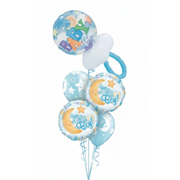 Bouquet compuesto por 2 Globos metalizados de 18″ (45 cm), 3 globos latex estampados de 11″ (28 cm) y pesa.