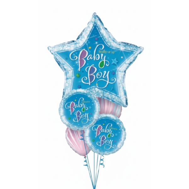 Bouquet compuesto por 2 Globos metalizados de 18″ (45 cm), 3 globos latex estampados de 11″ (28 cm) y pesa.