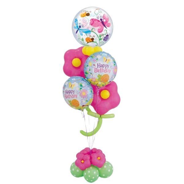 Lindo arreglo compuesto de 1 Globo burbuja 22″ (56 cm), 2 Globo látex de 11″ (28 cm), 2 globos metalizados de 18¨ (46cm) y decoración.