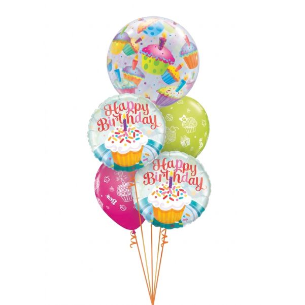 Arreglo cumpleaños con 1 Globo burbuja 22″ (56cm), mas decoracion en la parte inferior.